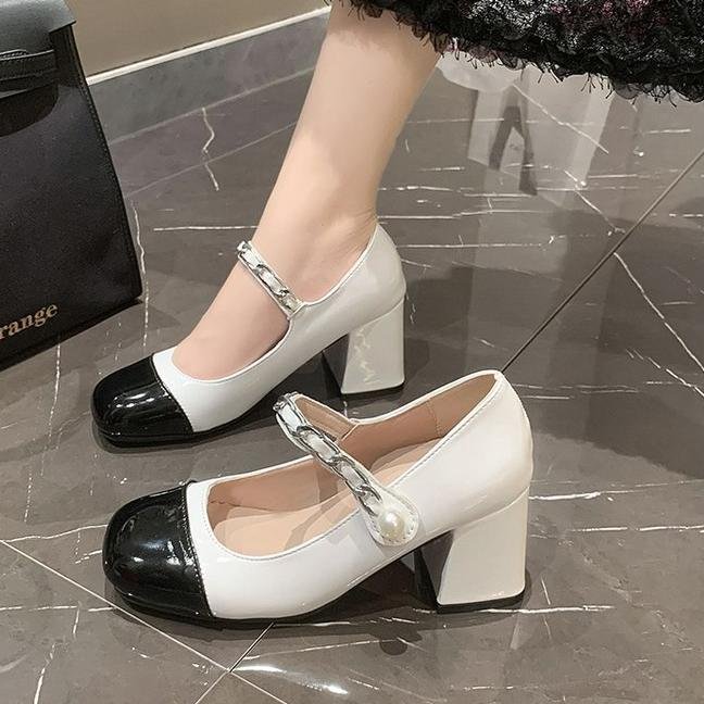 Pearl chain, patent leather chunky heel, for Women, Style Shoes – RV2581