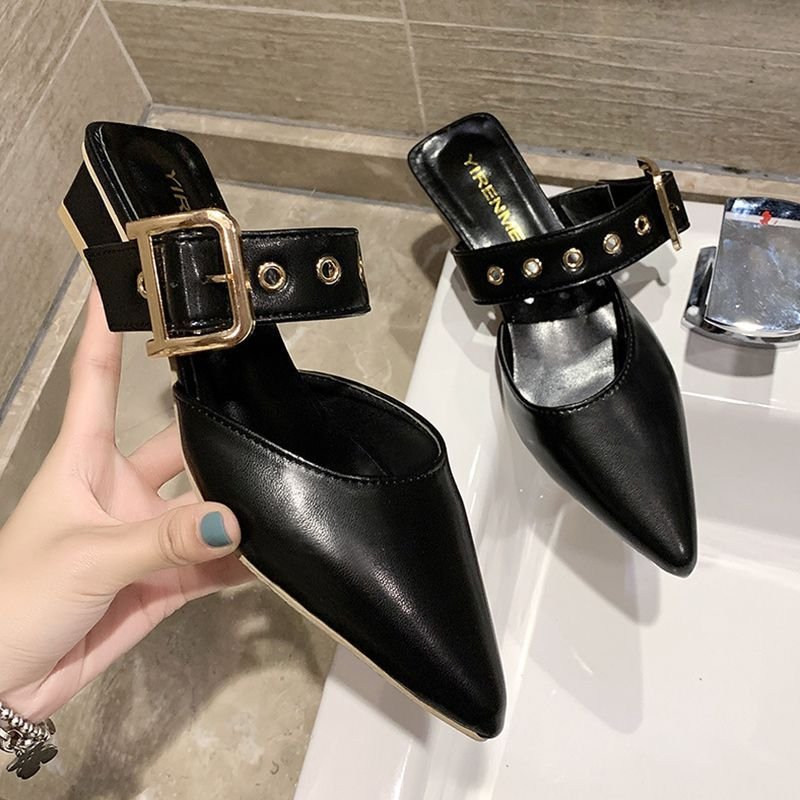 Women’s Korean style pointed toe chunky heel closed toe slippers, Box Heel – RV1475