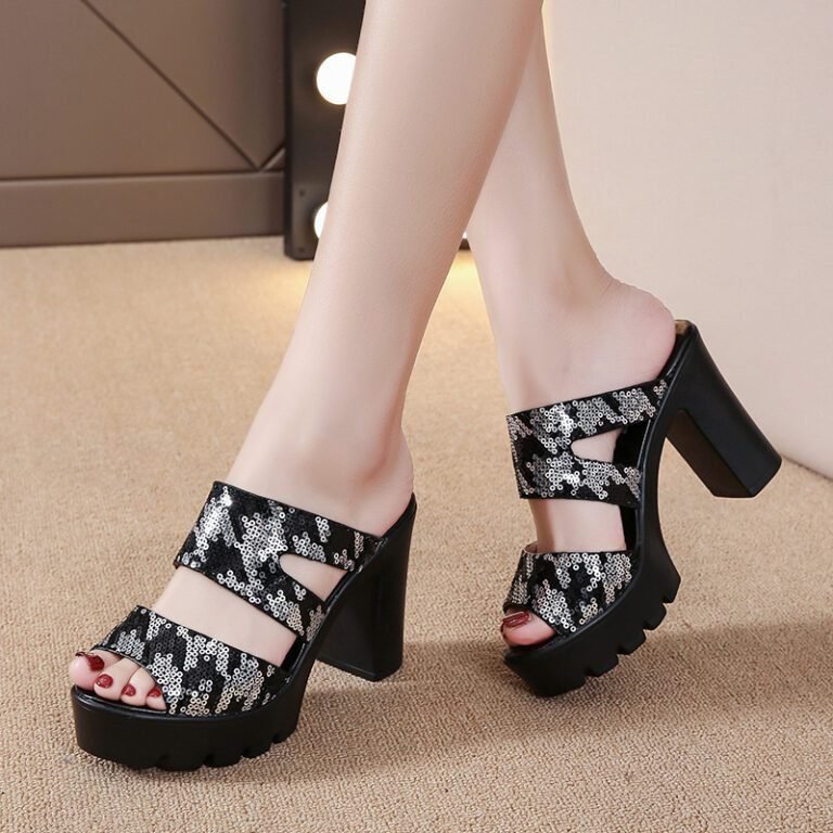 Women’s Sandals with one-piece heel, Sequined, casual, chunky heel Shoes, Box heel-RV1325